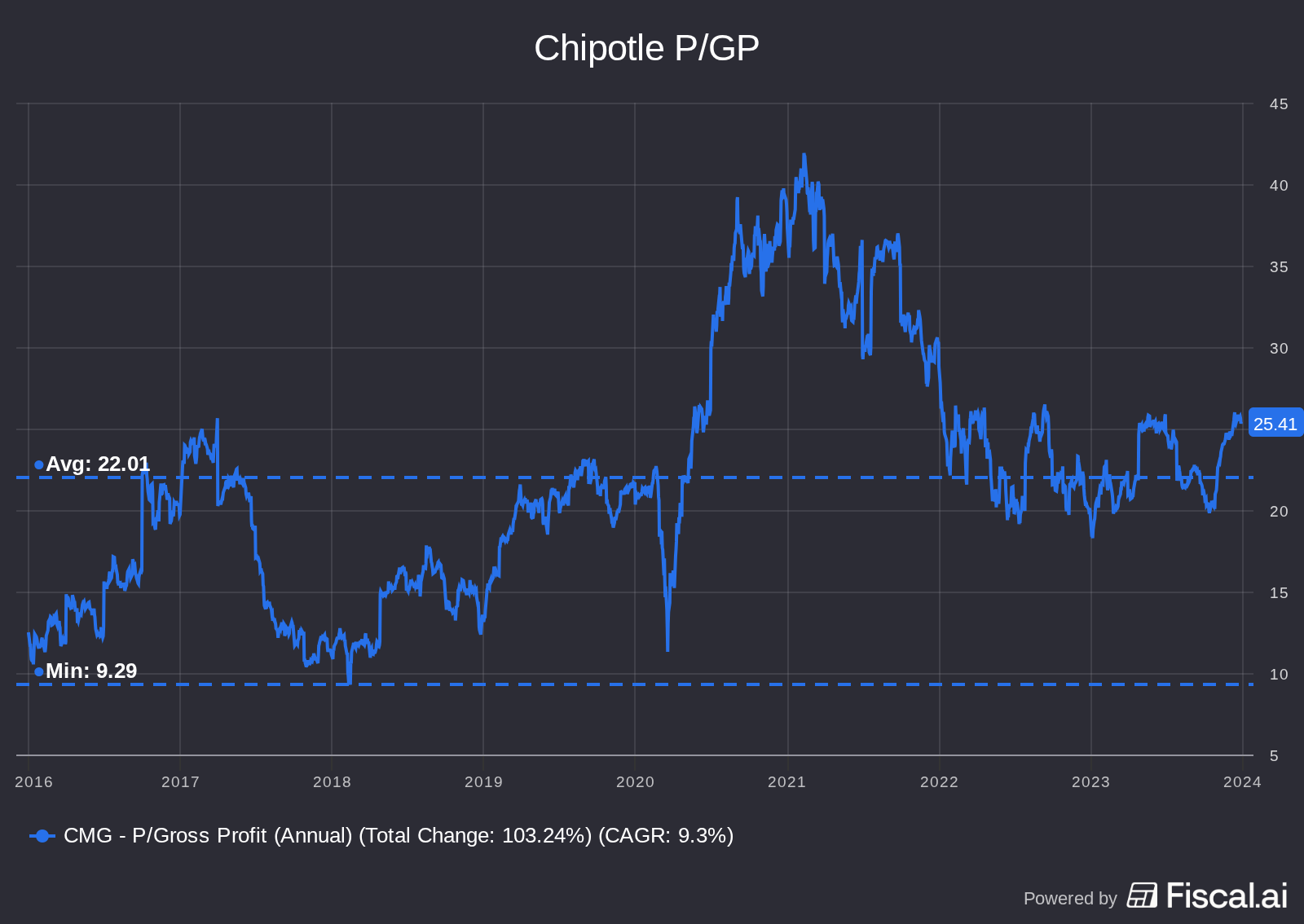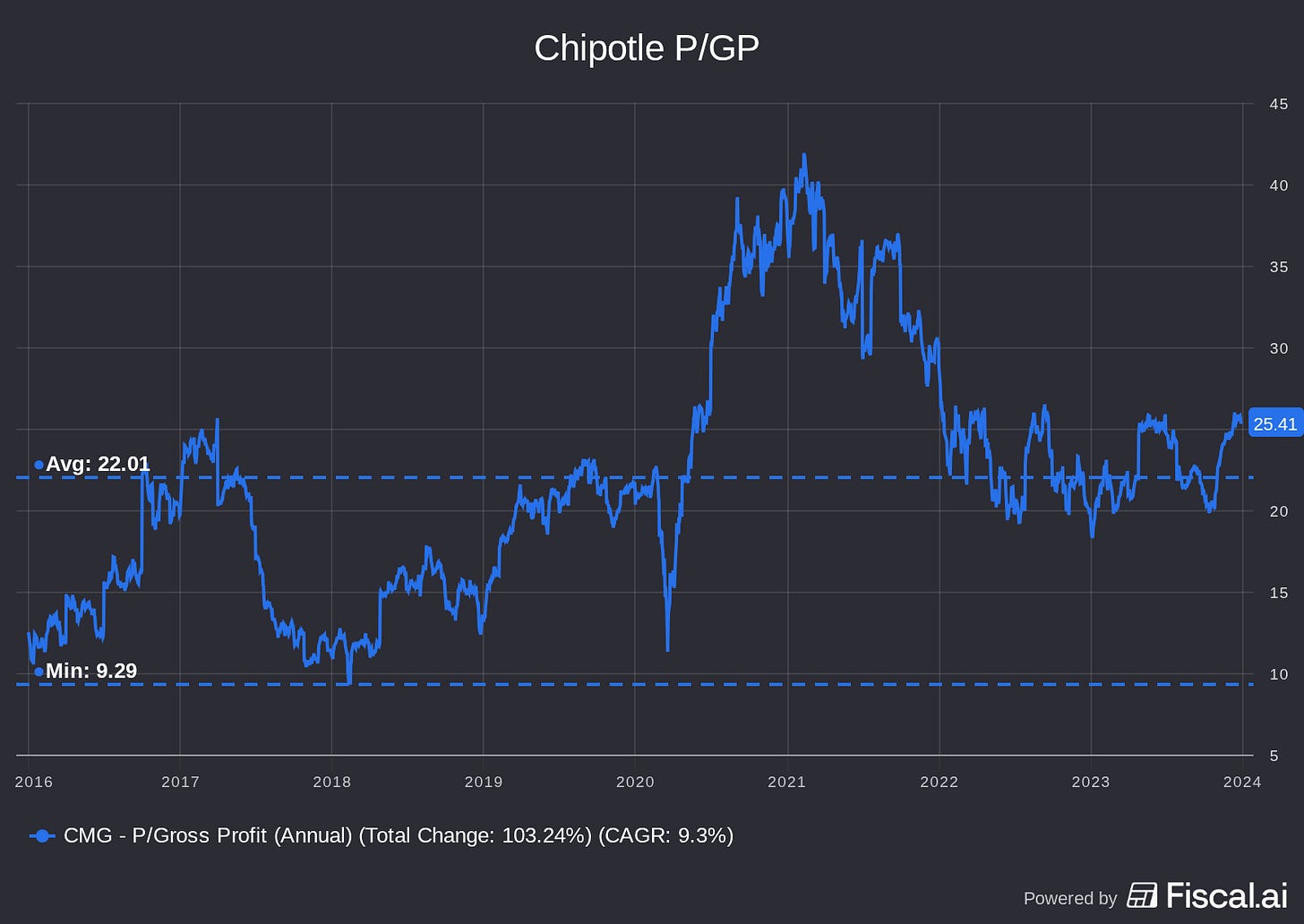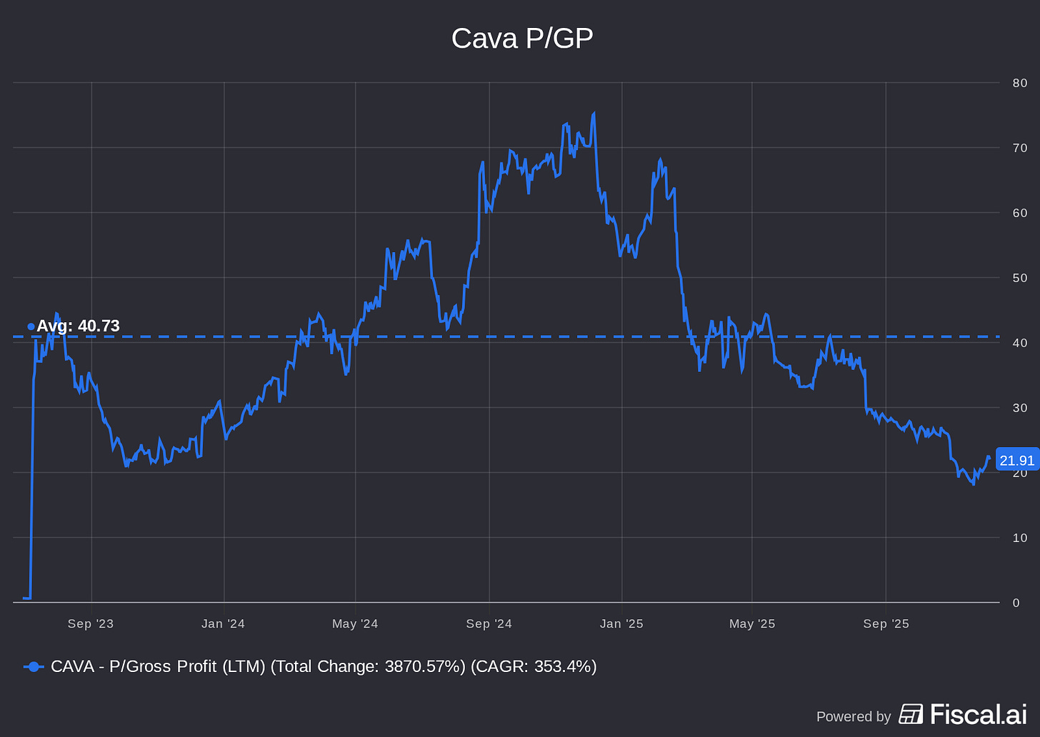 With this context, you can understand why investors bid up Cava stock to the moon. It has had an average P/GP of 40 since going public, and traded as high as 70(!) in late 2024.