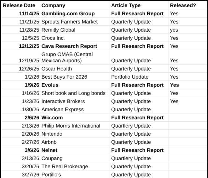 Today, we have a quarterly update for Interactive Brokers. Below is a table of recently published articles, along with the upcoming Emerging Moats schedule for Q1 2026.