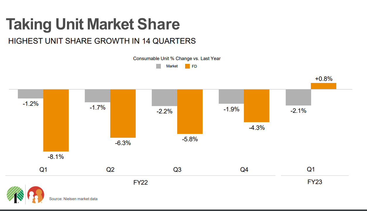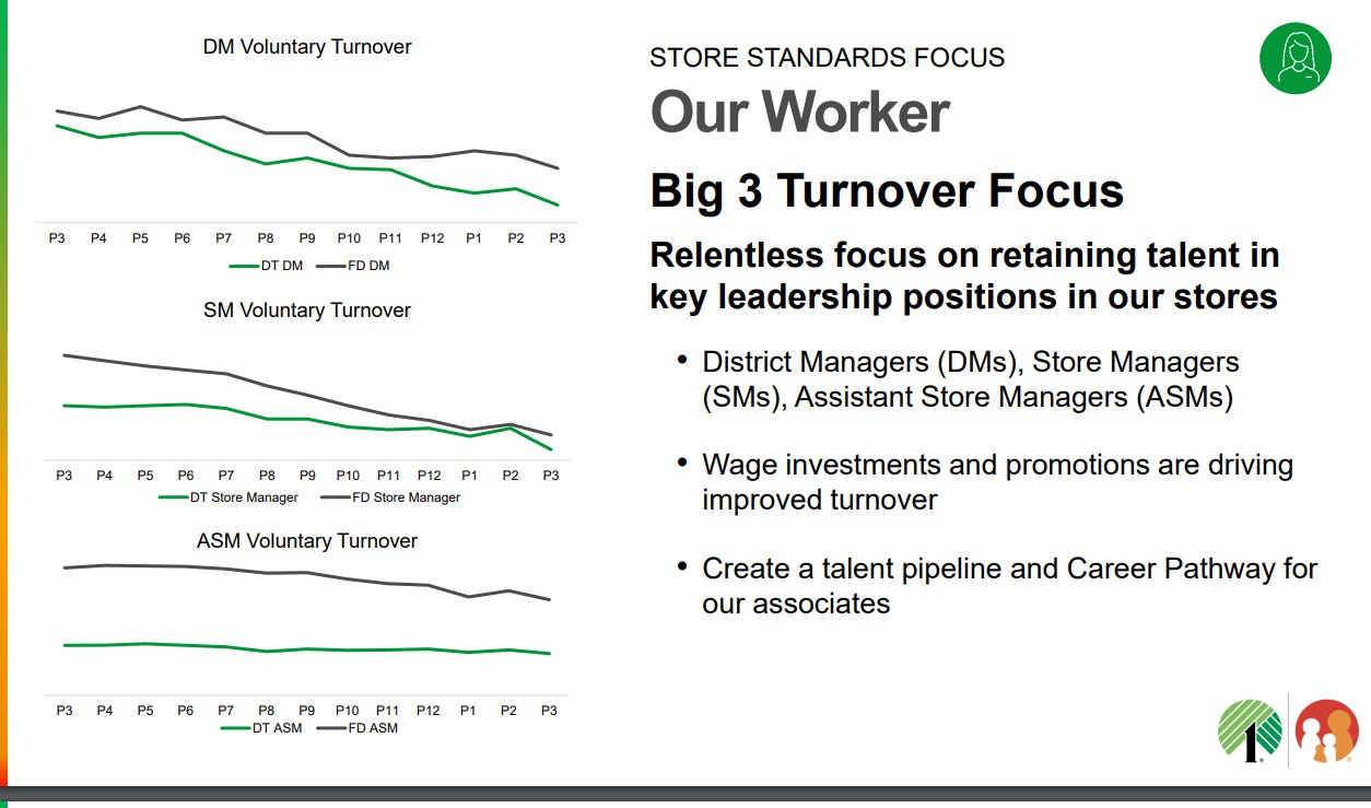 (Ryan) FD closing the gap on sales per square foot with Dollar General. Part of it comes from the new layouts. Supply chain improvements to ensure product quality.