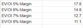 Like with Dollar General, I am going to take DT/FD and apply some blended operating margin assumptions to see what the valuation could look like. Going to be an EV/OI multiple