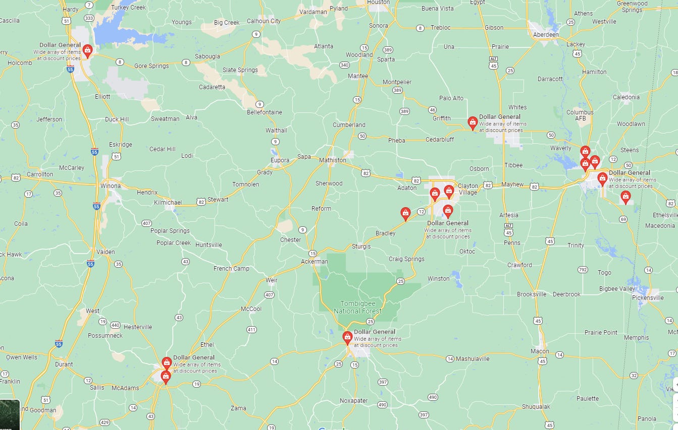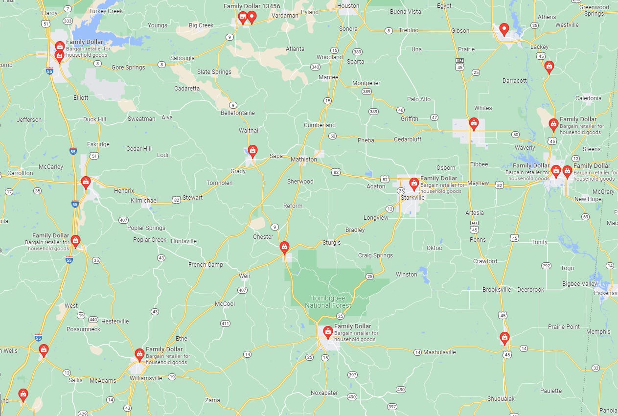 Below, I have two Google Maps screenshots of the same area of Mississippi. One shows the Family Dollar locations, and one shows the Dollar General locations. While not indicative of the entire country, I think it shows how the competition in this industry can work.