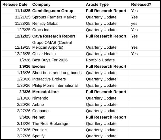 Here is the Q1 schedule for Emerging Moats Research. Full reports will be coming out on Evolus, MercadoLibre, and Nelnet. Reach out to get your (one-time) complimentary trial to check out the service.