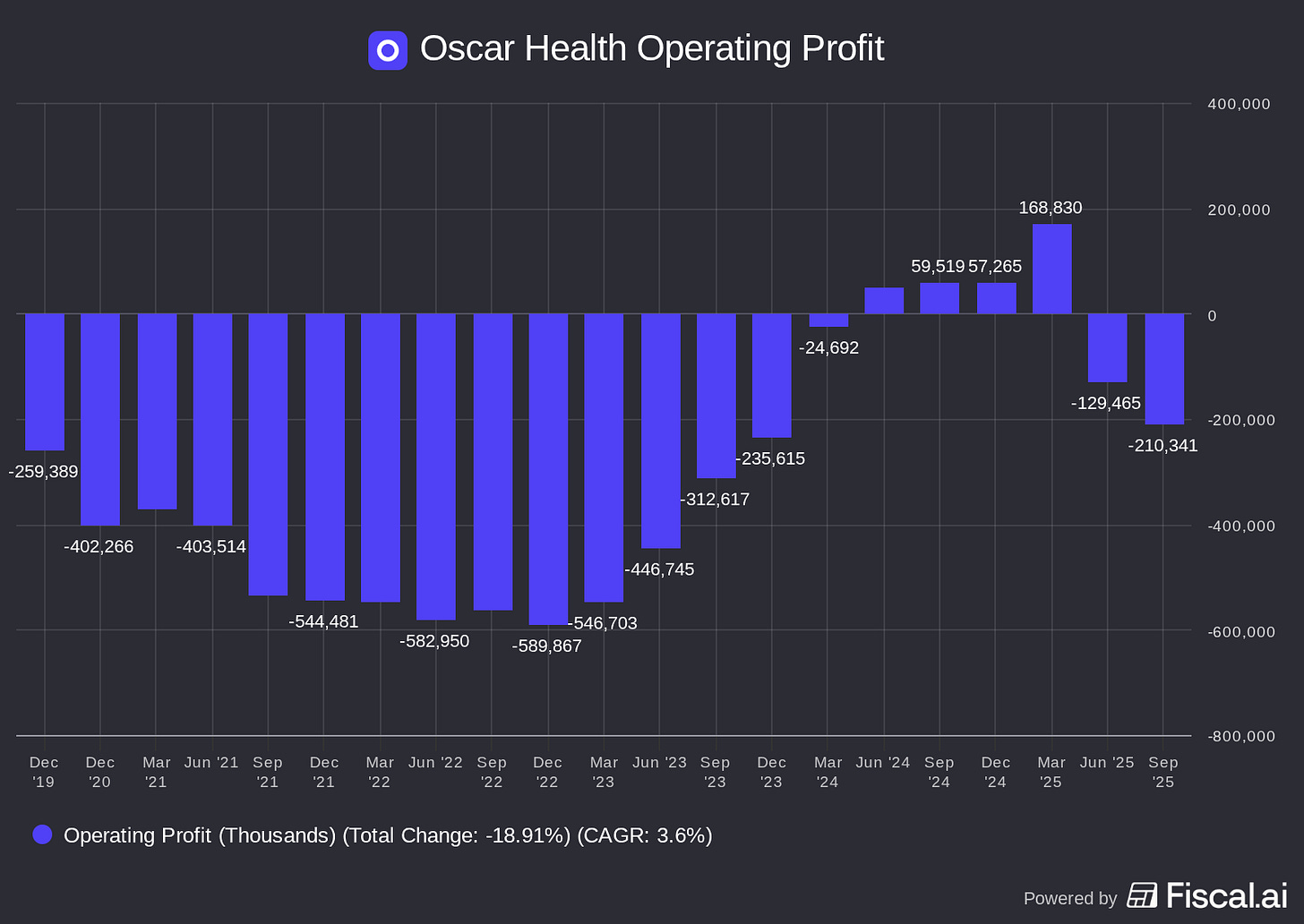 For an upstart with less scale than the legacy players, a rising MLR has reversed Oscar Health’s operating leverage, sending it from a LTM operating profit of $168 million in March 2025 to a $210 million loss in September. 2025 guidance calls for a $250 million loss at the midpoint.