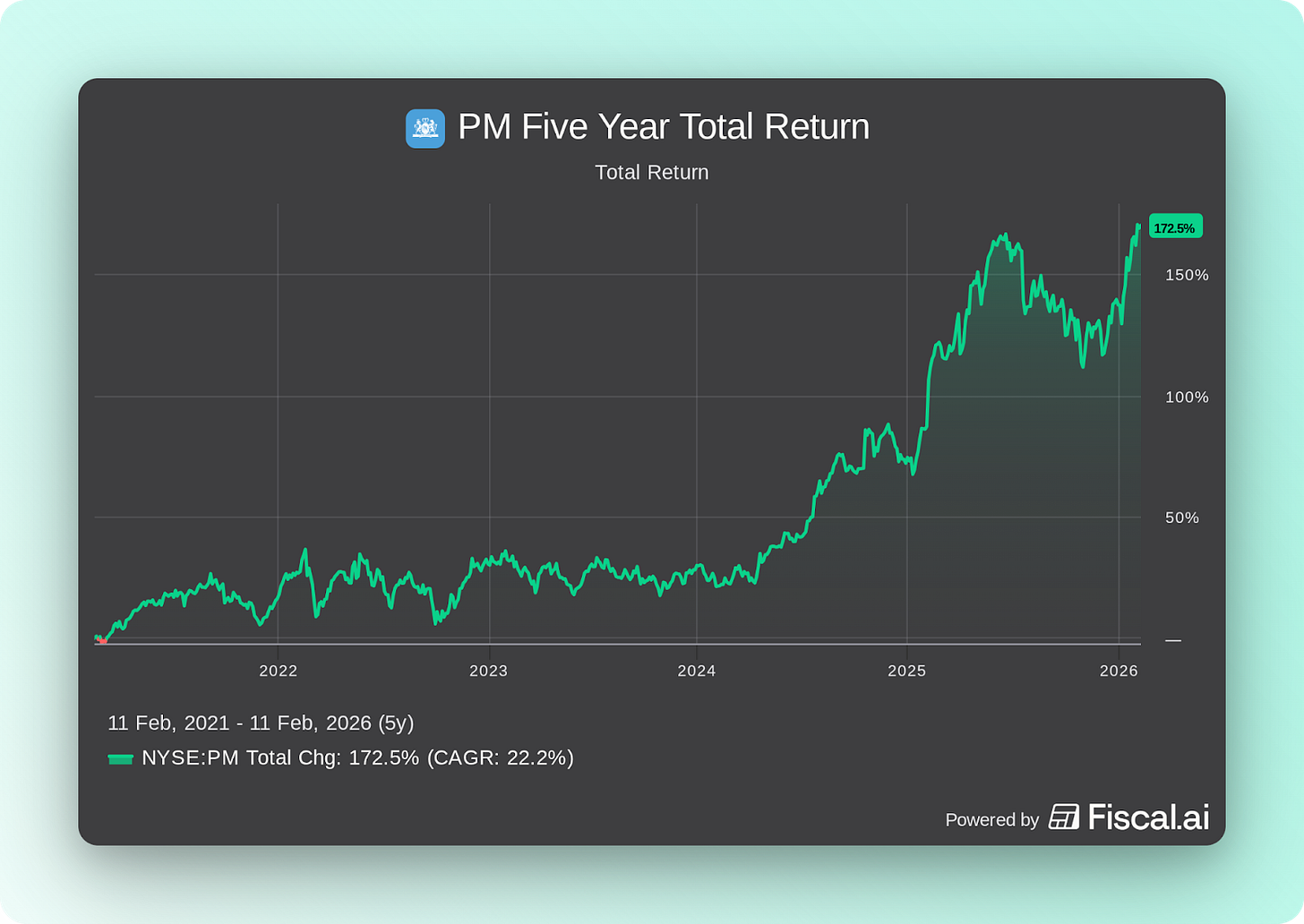 In 2023 - 2024, I purchased some shares of Philip Morris International (PM) for around $100. During the tariff tantrum in April, I decided to sell when the stock ripped to $160 while the rest of my watchlist was crashing (I used the proceeds to move into Airbnb and IBKR). As of this writing, the stock trades around $183 and has produced a total return of 171% over the last five years, most of which have come in the last two years.