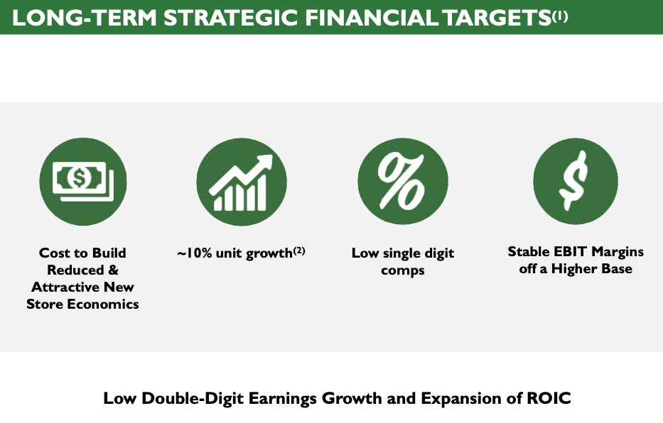 They are projecting 10% annual growth in store count, low single digit comp store sales growth, flat EBIT margins, but lower cost to build so potentially higher ROIC.