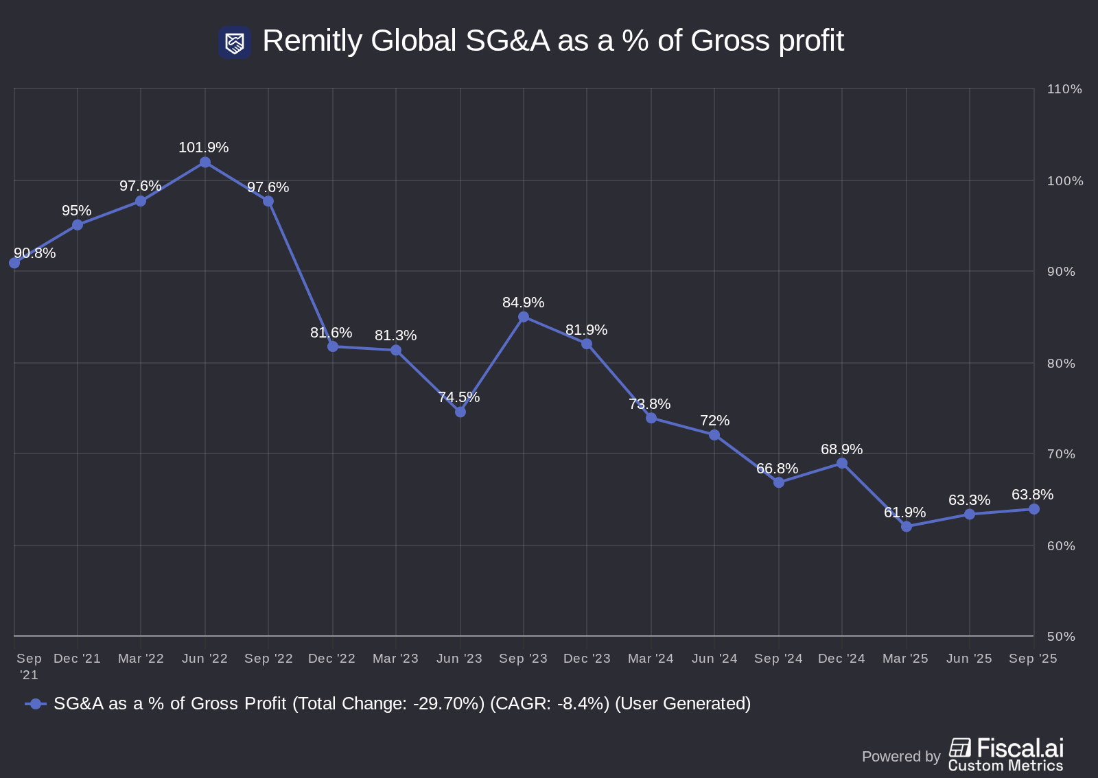 First, we can look at Remitly’s total Selling, General, and Administrative expenses as a % of gross profits. Over the last few years, the company has made progress on the operating expense line. Bringing operating expenses from 100% to 65% is fantastic leverage of the P&L, allowing Remitly to invest heavily into product development (which is not included in SG&A on Fiscal.AI) while also generating positive GAAP operating income and positive free cash flow.