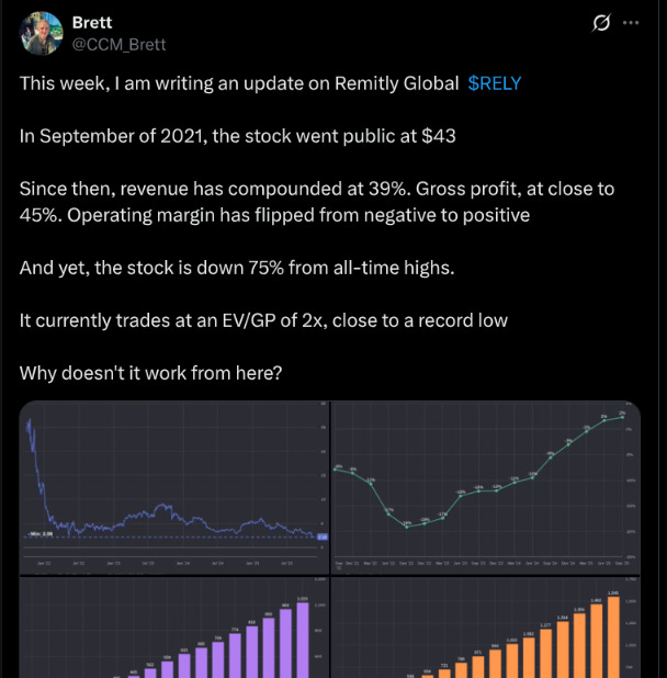 Investors are (again) bailing on Remitly. I cannot figure out why. The stock now trades at just 2x gross profit, the business is expected to keep growing in the double-digits, and management is starting to accelerate repurchases.