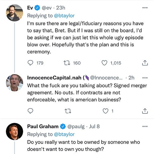 A lot of these VC/technology/software people don’t seem to care about shareholders, but only how they look reputationally to the giants of the industry like Musk. The revealing of this mindset should be concerning for anyone looking to invest money in companies where these people are on the executive team or board of directors. If they don’t respect shareholders in this situation, why would they ever respect you? Huge red flag.