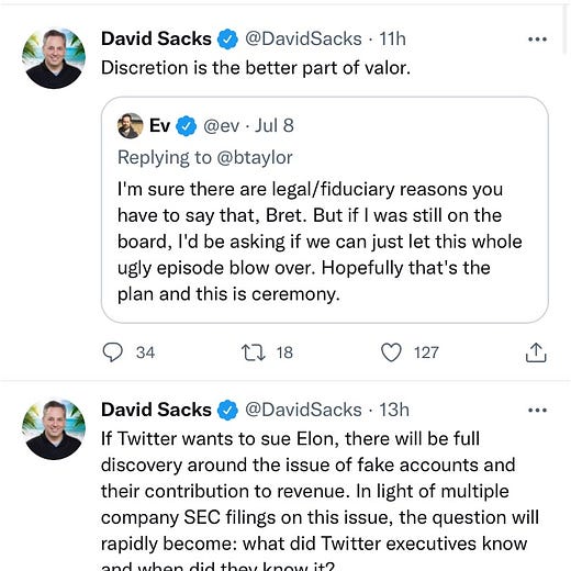 As many of you know, Elon Musk is trying to get out of a deal he signed to buy Twitter for $44 billion. Now, Twitter is suing him to close the deal, which I believe will be fought in a Delaware court. I won’t bore you again with the details (here's an update from Bloomberg), but I’ve become intrigued with the Silicon Valley people defending Musk and opposing Twitter: